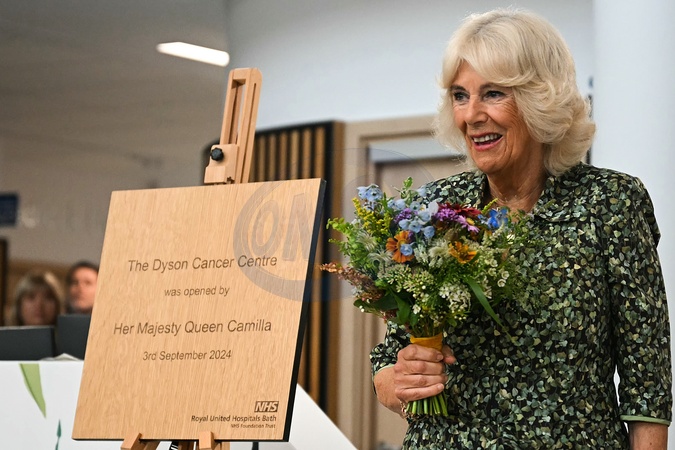 Britain's Queen Camilla (R) delivers a speech after unveiling a plaque for the official opening of the Dyson Cancer Centre part of the Royal United Hospitals Bath NHS Foundation Trust, in Bath, western England, on September 3, 2024. The new Dyson Cancer Centre brings together the majority of the Royal United Hospital's cancer services, including a research hub, chemotherapy and radiotherapy services, a 22-bed in-patient ward, a dedicated pharmacy and nuclear medicine and physics teams., Credit:JUSTIN TALLIS / Avalon
