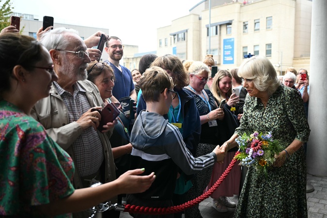 Britain's Queen Camilla (R) is greeted by well-wishers as she leaves the Dyson Cancer Centre at the Royal United Hospitals Bath NHS Foundation Trust, in Bath, western England, on September 3, 2024 at the end of her visit. The new Dyson Cancer Centre brings together the majority of the Royal United Hospital's cancer services, including a research hub, chemotherapy and radiotherapy services, a 22-bed in-patient ward, a dedicated pharmacy and nuclear medicine and physics teams., Credit:JUSTIN TALLIS / Avalon