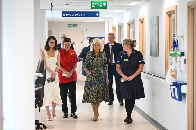 Britain's Queen Camilla (C), flanked by Royal United Hospitals Chief Executive Cara Charles-Barks (L), visits the Dyson Cancer Centre, at the Royal United Hospitals Bath NHS Foundation Trust, in Bath, western England, on September 3, 2024. The new Dyson Cancer Centre brings together the majority of the Royal United Hospital's cancer services, including a research hub, chemotherapy and radiotherapy services, a 22-bed in-patient ward, a dedicated pharmacy and nuclear medicine and physics teams., Credit:JUSTIN TALLIS / Avalon