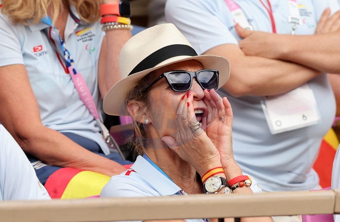 L'infante Elena d'Espagne assiste à la rencontre de tennis fauteuil entre Stéphane Houdet (FR) et Martín de la Puente (ESP) lors des jeux paralympiques Paris 2024