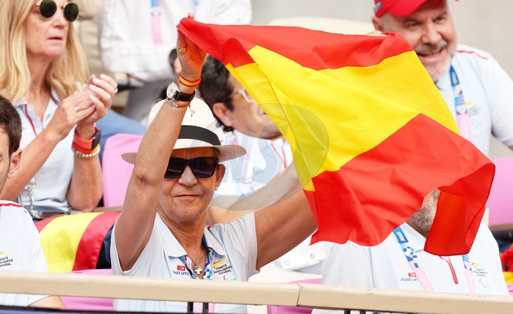 L'infante Elena d'Espagne assiste à la rencontre de tennis fauteuil entre Stéphane Houdet (FR) et Martín de la Puente (ESP) lors des jeux paralympiques Paris 2024