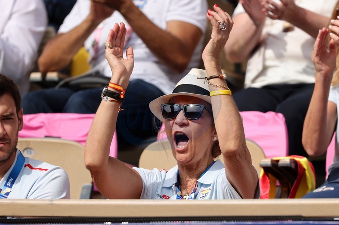Infantka Elena z Hiszpanii uczestniczy w meczu tenisa na wózkach inwalidzkich pomiędzy Stéphane Houdet (FR) i Martín de la Puente (ESP) podczas Igrzysk Paraolimpijskich w Paryżu w 2024 r.