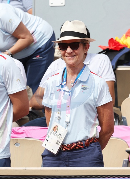 L'infante Elena d'Espagne assiste à la rencontre de tennis fauteuil entre Stéphane Houdet (FR) et Martín de la Puente (ESP) lors des jeux paralympiques Paris 2024