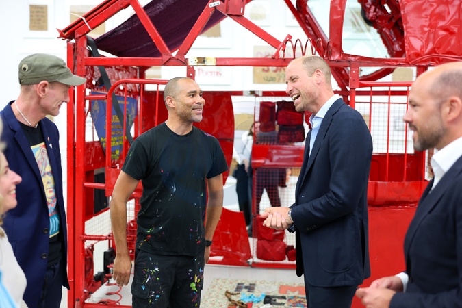 LONDON, ENGLAND - SEPTEMBER 05: Prince William, Prince of Wales speaks to one of the artist during the "Homelessness: Reframed" exhibition at the saatchi gallery on September 05, 2024 in London, England. Prince William met with artists behind the newly commissioned works for the exhibition, as well as individuals whose personal experiences have served as inspiration for some of the pieces., Credit:Chris Jackson / Avalon