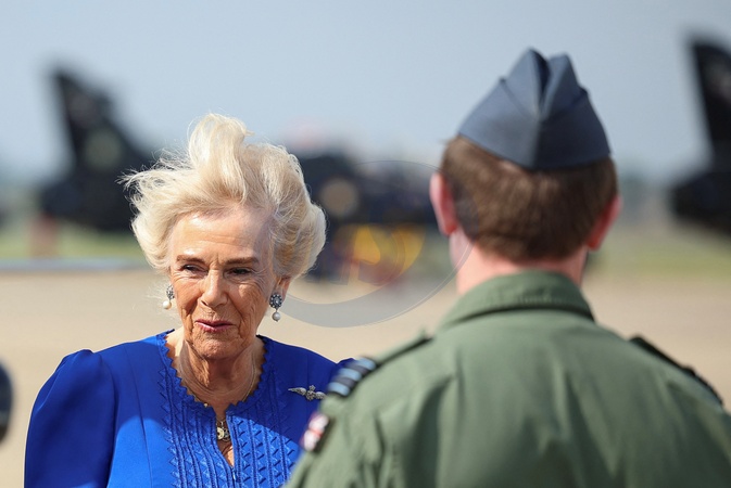 A gust of wind blows Britain's Queen Camilla's hair, during her visit to RAF Leeming, Northallerton, Britain, September 6, 2024., Credit:Phil Noble / Avalon