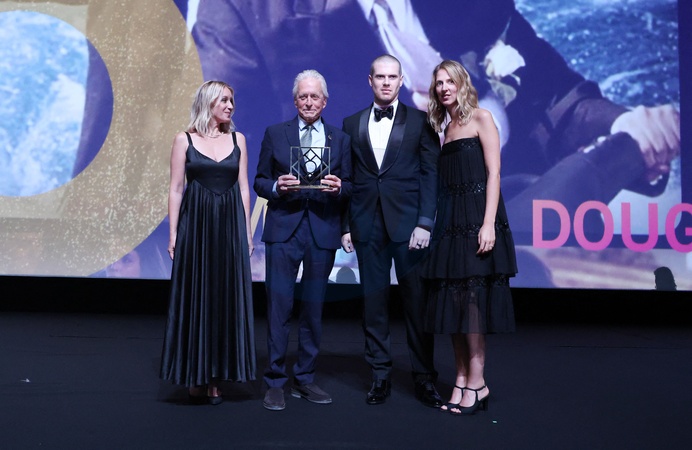 Ludivine Sagnier, Michael Douglas, Joy Desseigne Barriere et son frère Alexandre Desseigne Barriere lors de la soirée d'ouverture de la 50eme édition du Festival du Cinema Américain de Deauville, France, le 6 Septembre 2024. © Denis Guignebourg/BestImage Celebs during the 50th Deauville American Film Festival opening ceremony on September 6, 2024 in Deauville, France.