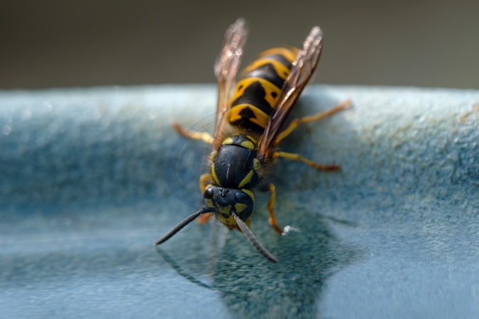 Wasp drinking water in Autumn sunshine, in a garden near Ely, Cambridgeshire. United Kingdom. 01 September 2024, Credit:Mark Fairhurst / Avalon