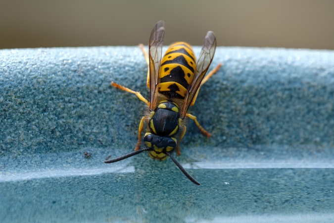 Wasp drinking water in Autumn sunshine, in a garden near Ely, Cambridgeshire. United Kingdom. 01 September 2024, Credit:Mark Fairhurst / Avalon