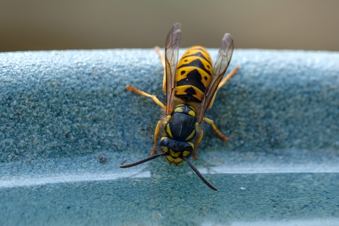 Wasp drinking water in Autumn sunshine, in a garden near Ely, Cambridgeshire. United Kingdom. 01 September 2024, Credit:Mark Fairhurst / Avalon