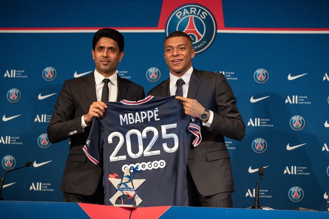 Info - Kylian Mbappé rejette la médiation avec le PSG proposée par la LFP sur le litige financier - Info - Kylian Mbappé a saisi la LFP et l'UEFA pour réclamer 55 millions d'euros impayés par le PSG - Football - Le Real Madrid officialise l'arrivée de Kylian Mbappé pour cinq ans - Info du 15 février 2024 - Kylian Mbappé a annoncé au PSG son départ cet été - Nasser al-Khelaïfi, président-directeur général du Paris Saint-Germain, et Kylian Mbappé lors d'une conférence de presse suite au renouvellement du contrat de l'attaquant au Paris Saint-Germain jusqu'en 2025, au Parc des Princes à Paris, France, le 23 mai 2022. © Aurelien Morissard/Panoramic/Bestimage Kylian Mbappe of PSG during a press conference following the renewal of his contract at Paris Saint-Germain until 2025, at Parc des Princes stadium in Paris, France, on May 23, 2022.