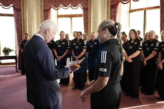 King Charles III receives a gift as he meets New Zealand's Black Ferns rugby union team at Buckingham Palace in London. Picture date: Wednesday September 11, 2024. PA Photo. See PA story ROYAL King. Photo credit should read: Aaron, Credit:Aaron Chown / Avalon