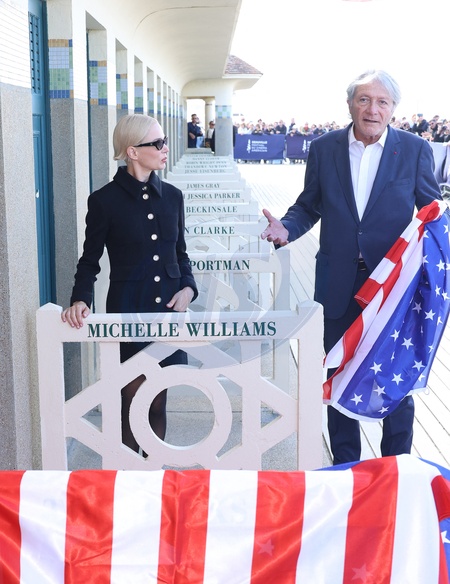 Michelle Williams inaugure sa cabine en présence du maire de la ville Philippe Augier, lors du 50ème Festival du Cinéma Américain de Deauville