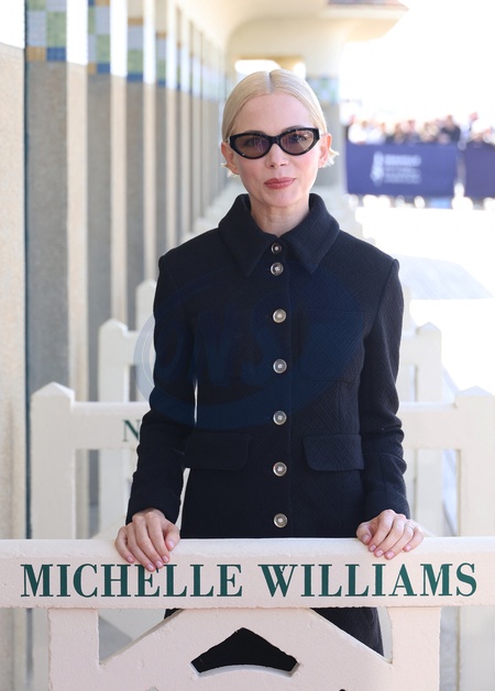 Michelle Williams inaugure sa cabine en présence du maire de la ville Philippe Augier, lors du 50ème Festival du Cinéma Américain de Deauville
