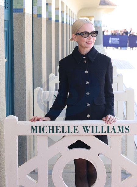 Michelle Williams inaugure sa cabine en présence du maire de la ville Philippe Augier, lors du 50ème Festival du Cinéma Américain de Deauville