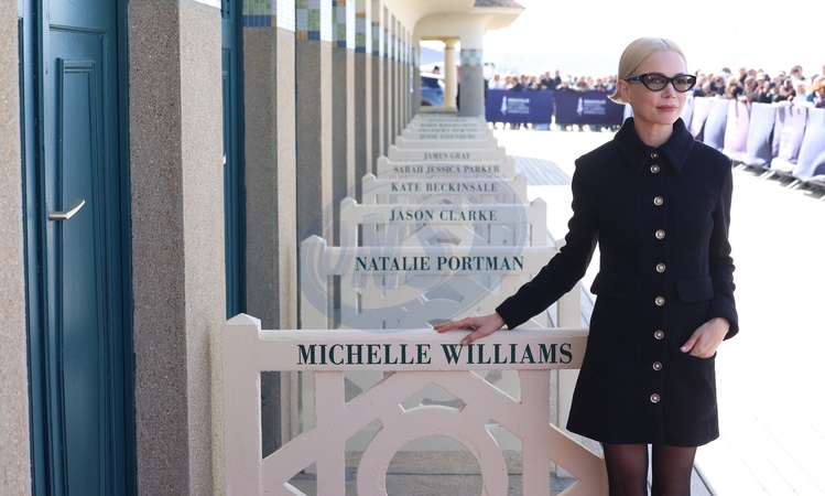 Michelle Williams inaugure sa cabine en présence de Philippe Augier, maire de la ville, lors du 50ème Festival du Cinéma Américain de Deauville , le 12 septembre 2024. © Denis Guignebourg / Bestimage Michelle Williams inaugurates her cabin, in the presence of the mayor of the city P. Augier, during the 50th Deauville American Film Festival, on September 12, 2024.