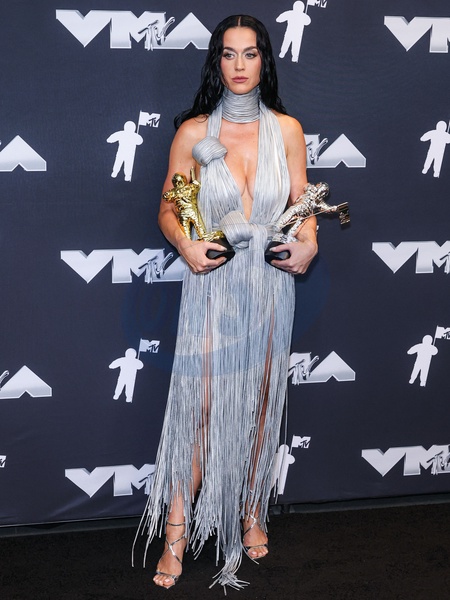 ELMONT, NEW YORK, USA - SEPTEMBER 11: Katy Perry, recipient of the Michael Jackson Video Vanguard Award and winner of the VMAs Most Iconic Performance award for 'Roar' (2013, live from Empire-Fulton Ferry Park) poses in the press room at the 2024 MTV Video Music Awards held at UBS Arena on September 11, 2024 in Elmont, New York, United States., Credit:Xavier Collin / Avalon