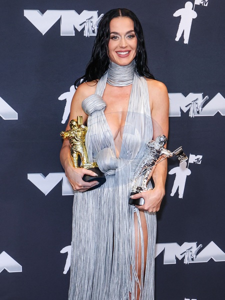 ELMONT, NEW YORK, USA - SEPTEMBER 11: Katy Perry, recipient of the Michael Jackson Video Vanguard Award and winner of the VMAs Most Iconic Performance award for 'Roar' (2013, live from Empire-Fulton Ferry Park) poses in the press room at the 2024 MTV Video Music Awards held at UBS Arena on September 11, 2024 in Elmont, New York, United States., Credit:Xavier Collin / Avalon