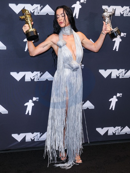 ELMONT, NEW YORK, USA - SEPTEMBER 11: Katy Perry, recipient of the Michael Jackson Video Vanguard Award and winner of the VMAs Most Iconic Performance award for 'Roar' (2013, live from Empire-Fulton Ferry Park) poses in the press room at the 2024 MTV Video Music Awards held at UBS Arena on September 11, 2024 in Elmont, New York, United States., Credit:Xavier Collin / Avalon