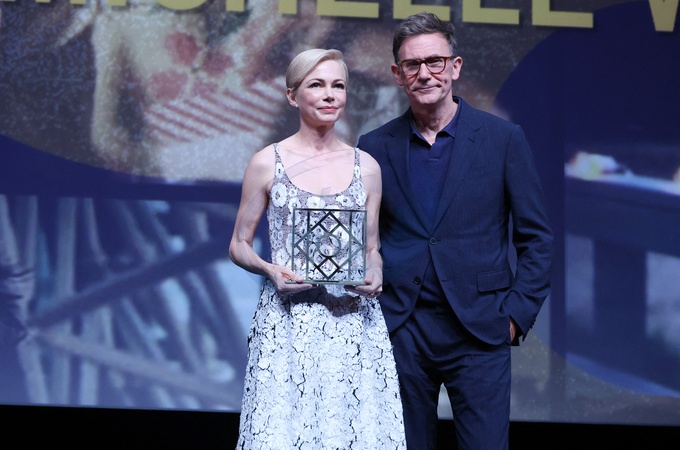 Michelle Williams reçoit le prix "Deauville Talent Award" avant la projection du film 'Anora' lors de la 50ème édition du Festival du Cinema Américain de Deauville le 12 septembre 2024. Michel Hazanavicius lui remet le prix. © Denis Guignebourg / Bestimage Michelle Williams receives the Deauville Talent Award before the screening of the film ‘Anora' at the 50th Deauville American Film Festival on 12 September 2024.
