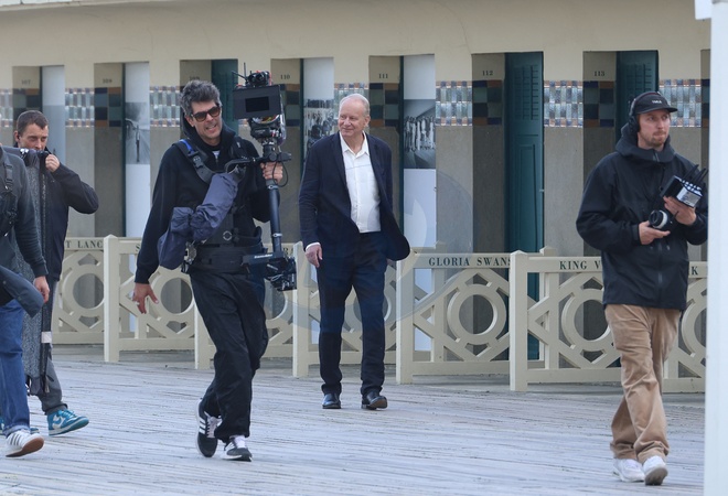 Exclusif - Stellan Skarsgård tourne une scène du prochain film de Joachim Trier (Sentimental Value) sur les planches à Deauville