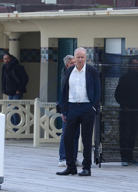 Exclusif - Stellan Skarsgård tourne une scène du prochain film de Joachim Trier (Sentimental Value) sur les planches à Deauville lors de la 50ème édition du festival du cinéma américain à Deauville le 12 septembre 2024. Exclusive - No web en Suisse / Belgique Stellan Skarsgård shoots a scene from Joachim Trier's next film (Sentimental Value) on stage at the 50th American Film Festival in Deauville on 12 September 2024.
