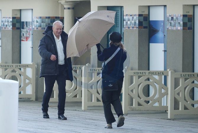 Exclusif - Stellan Skarsgård tourne une scène du prochain film de Joachim Trier (Sentimental Value) sur les planches à Deauville lors de la 50ème édition du festival du cinéma américain à Deauville le 12 septembre 2024. Exclusive - No web en Suisse / Belgique Stellan Skarsgård shoots a scene from Joachim Trier's next film (Sentimental Value) on stage at the 50th American Film Festival in Deauville on 12 September 2024.