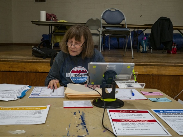 March 5, 2024, Arlington, Virginia, USA: Election worker SUSAN RANDOLPH reviews primary rules and ballots while waiting for the next voter., Credit:Sue Dorfman / Avalon