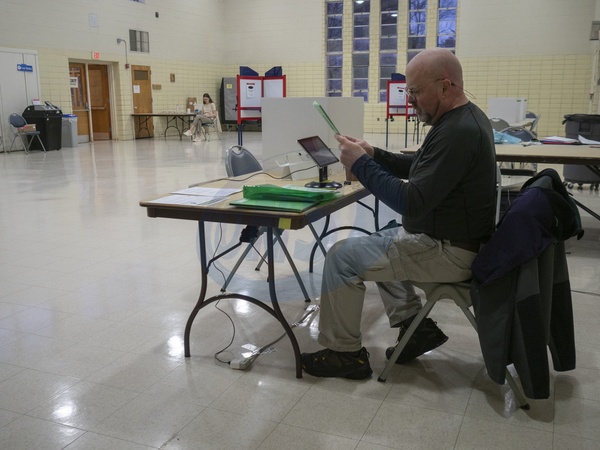 March 5, 2024, Arlington, Virginia, USA: A poll worker reviews primary materials while waiting for the next voter in the VirginiaÕs Super Tuesday Presidential Primary., Credit:Sue Dorfman / Avalon