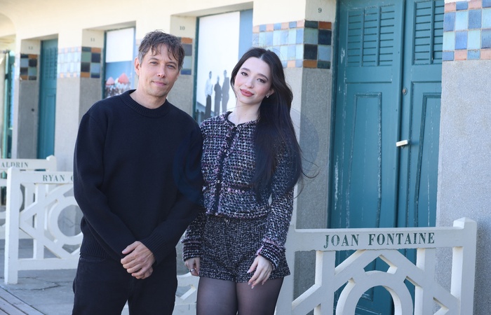 Mikey Madison et Sean Baker, sur la plage, au photocall du film "Anora" lors du 50ème Festival du Cinéma Américain de Deauville