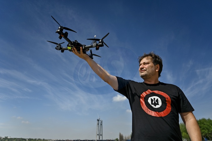 ZAPORIZHZHIA, UKRAINE - SEPTEMBER 11, 2024 - Deputy Director for Strategic Communications Rudolf Akopian holds a model of the Ukrainian FPV drone "General Chereshnya", Zaporizhzhia, southeastern Ukraine, Credit:Dmytro Smolienko / Avalon