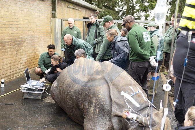 Beluki the greater one horned rhino's keepers and vets from Whipsnade Zoo gather to see her ultrasound scan, performed by specialists from IWZ. Whipsnade Zoo is celebrating an extraordinary result for a female greater one horned rhinoceros, which revealed medical treatment has significantly reduced the presence of tumours in her reproductive tract. The conservation zoo's two female greater one-horned rhinos (Rhinoceros unicornis), 29-year-olds Behan and Beluki, have been under the care of the zoo's vets, after both were found to have tumours and cysts in their reproductive organs, which was impacting their health and welfare. As part of their tireless efforts to treat the condition – which is sadly common for older female rhinos in both zoos and the wild – Whipsnade's vets called upon reproductive specialists at the Leibniz Institute for Zoo and Wildlife Research (IWZ) in Germany. A treatment plan was devised for the rhinos with both receiving an immune-contraceptive vaccine twice a year, designed to stop hormones from stimulating the tumours, and ultimately shrinking them. This week, both rhinos were given a general anaesthetic so that the Zoo's veterinary team and rhino keepers could see how the treatment was working and assess the rhinos' health. IWZ's Thomas B. Hildebrandt, Frank Goritz and Susane Holtze flew in from Berlin to assist with examining the rhinos, and they were also joined by a leading specialist equine surgeon from Rossdales Veterinary Surgeons. During the ultrasound scan, vets were surprised – and delighted – to see that Behan's previously large tumours had responded so well to treatment that they could barely be seen at all., Credit:ZSL / Avalon