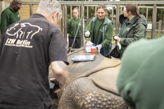 Dr Taina Strike and Whipsnade Zoo's vets preparing Behan for her ultrasound and health check. Whipsnade Zoo is celebrating an extraordinary result for a female greater one horned rhinoceros, which revealed medical treatment has significantly reduced the presence of tumours in her reproductive tract. The conservation zoo's two female greater one-horned rhinos (Rhinoceros unicornis), 29-year-olds Behan and Beluki, have been under the care of the zoo's vets, after both were found to have tumours and cysts in their reproductive organs, which was impacting their health and welfare. As part of their tireless efforts to treat the condition – which is sadly common for older female rhinos in both zoos and the wild – Whipsnade's vets called upon reproductive specialists at the Leibniz Institute for Zoo and Wildlife Research (IWZ) in Germany. A treatment plan was devised for the rhinos with both receiving an immune-contraceptive vaccine twice a year, designed to stop hormones from stimulating the tumours, and ultimately shrinking them. This week, both rhinos were given a general anaesthetic so that the Zoo's veterinary team and rhino keepers could see how the treatment was working and assess the rhinos' health. IWZ's Thomas B. Hildebrandt, Frank Goritz and Susane Holtze flew in from Berlin to assist with examining the rhinos, and they were also joined by a leading specialist equine surgeon from Rossdales Veterinary Surgeons. During the ultrasound scan, vets were surprised – and delighted – to see that Behan's previously large tumours had responded so well to treatment that they could barely be seen at all., Credit:ZSL / Avalon