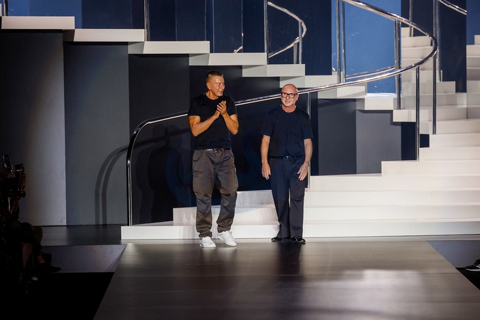 Domenico Dolce and Stefano Gabbana are seen on the runway at the Versace fashion show during the Milan Womenswear Spring/Summer 2025 on September 21, 2024 in Milan, Italy.