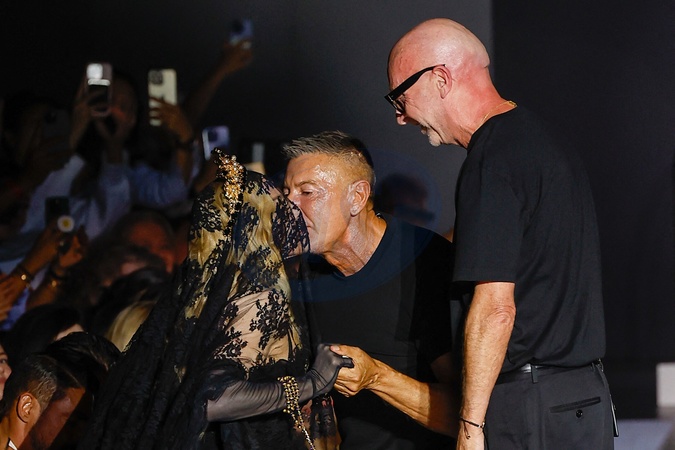 Madonna, Domenico Dolce et Stefano Gabbana au défilé pour Dolce&Gabbana printemps/été 2025 lors de la Fashion Week de Milan (MFW), à Milan, Italie, le 21 septembre 2024. A model walks the runway at the Dolce&Gabbana fashion show during the Milan Womenswear Spring/Summer 2025 on September 21, 2024 in Milan, Italy.