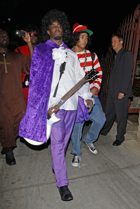 PRINCE DIDDY!! Sean Combs aka 'P-Diddy' dressed as superstar singer Prince complete with a white guitar, purple cloak and a huge wig seen leaving from the Playboy Mansion Halloween party in Beverly Hills