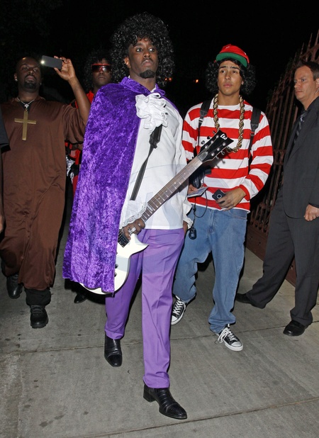 PRINCE DIDDY!! Sean Combs aka 'P-Diddy' dressed as superstar singer Prince complete with a white guitar, purple cloak and a huge wig seen leaving from the Playboy Mansion Halloween party in Beverly Hills