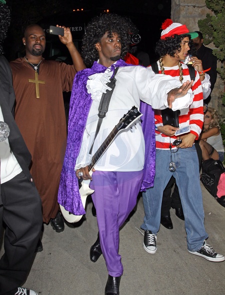 PRINCE DIDDY!! Sean Combs aka 'P-Diddy' dressed as superstar singer Prince complete with a white guitar, purple cloak and a huge wig seen leaving from the Playboy Mansion Halloween party in Beverly Hills