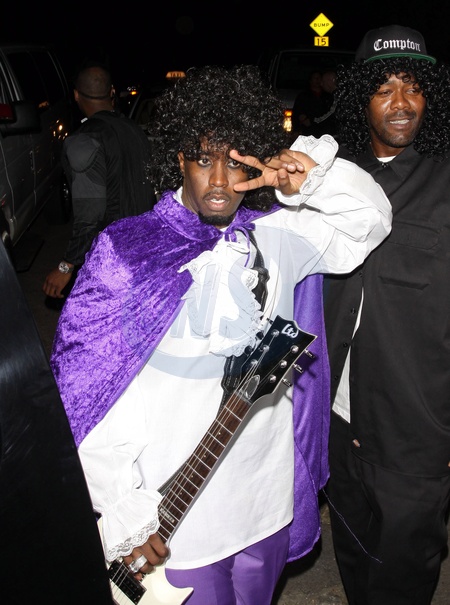 PRINCE DIDDY!! Sean Combs aka 'P-Diddy' dressed as superstar singer Prince complete with a white guitar, purple cloak and a huge wig seen leaving from the Playboy Mansion Halloween party in Beverly Hills