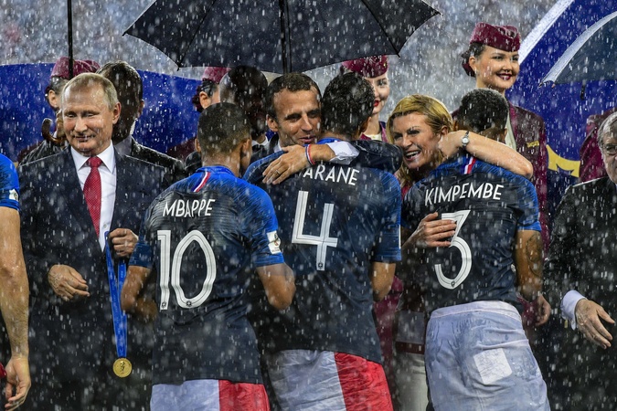 Info - Raphaël Varane prend sa retraite à 31 ans - Info du 28/02/2022 (La Russie exclue de la Coupe du Monde de Football par la Fifa) - Vladimir Poutine, Raphael Varane, le président Emmanuel Macron , Presnel Kimpembe et la présidente Croate Kolinda Grabar-Kitarovic - Finale de la Coupe du Monde de Football 2018 en Russie à Moscou, opposant la France à la Croatie (4-2) le 15 juillet 2018 © Moreau-Perusseau / Bestimage Final of the 2018 Football World Cup in Russia in Moscow, opposing France to Croatia (4-2) on July 15, 2018 - Finale de la Coupe du Monde de Football 2018 en Russie à Moscou, opposant la France à la Croatie (4-2) le 15 juillet 2018 © Moreau-Perusseau / Bestimage Final of the 2018 Football World Cup in Russia in Moscow, opposing France to Croatia (4-2) on July 15, 2018