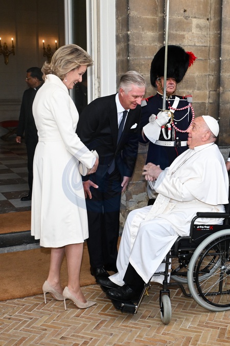 Le pape François est reçu par le roi Philippe et la reine Mathilde de Belgique au château de Laeken, à l'occasion de la visite officielle du souverain pontife en Belgique