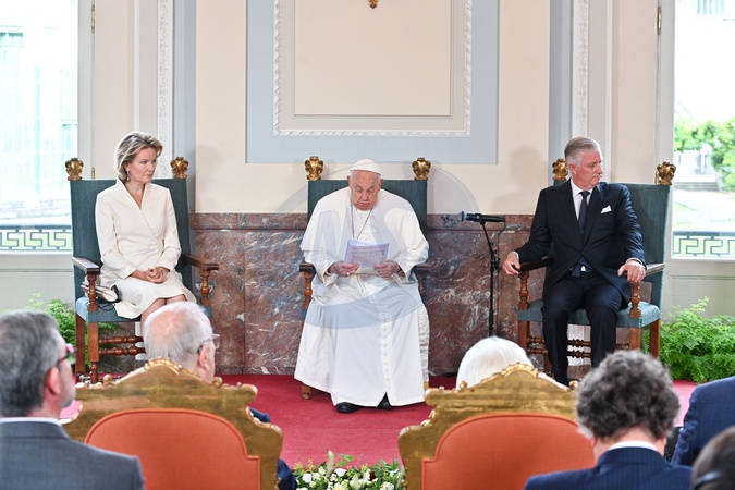 Le pape François est reçu par le roi Philippe et la reine Mathilde de Belgique au château de Laeken, à l'occasion de la visite officielle du souverain pontife en Belgique
