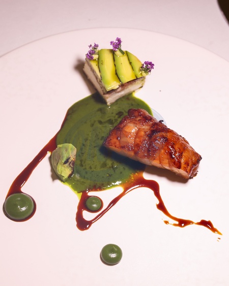 BBQ Monkfish with avocado, date molasses and basil at CORD by Le Cordon Bleu in Fleet Street, London, United Kingdom., Credit:Cat Morley / Avalon
