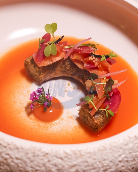 Spring Heritage Carrots with spiced chickpeas, sesame and parsley at CORD by Le Cordon Bleu in Fleet Street, London, United Kingdom., Credit:Cat Morley / Avalon