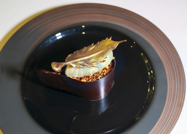 70% Guanaja Chocolate Delice with caramel sorbet, spiced hazelnuts and gold at CORD by Le Cordon Bleu in Fleet Street, London, United Kingdom., Credit:Cat Morley / Avalon