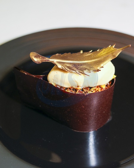 70% Guanaja Chocolate Delice with caramel sorbet, spiced hazelnuts and gold at CORD by Le Cordon Bleu in Fleet Street, London, United Kingdom., Credit:Cat Morley / Avalon