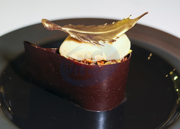 70% Guanaja Chocolate Delice with caramel sorbet, spiced hazelnuts and gold at CORD by Le Cordon Bleu in Fleet Street, London, United Kingdom., Credit:Cat Morley / Avalon