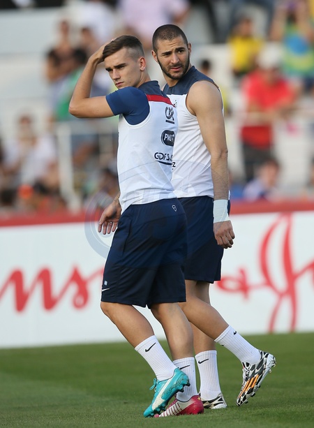 Info - Antoine Griezmann annonce sa retraite internationale - Karim Benzema et Antoine Griezmann - Entraînement de l'Equipe de France à Ribeirao Preto, le 13 juin 2014. France football team training in Ribeirao Preto, Brazil, on June 13th 2014.