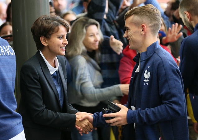 Info - Antoine Griezmann annonce sa retraite internationale - Najat Vallaud-Belkacem et Antoine Griezmann - La ministre des sports Najat Vallaud-Belkacem accueille l'équipe de France de football à leur arrivée à l'hôtel de Porto Alegre au Brésil, le 14 juin 2014.