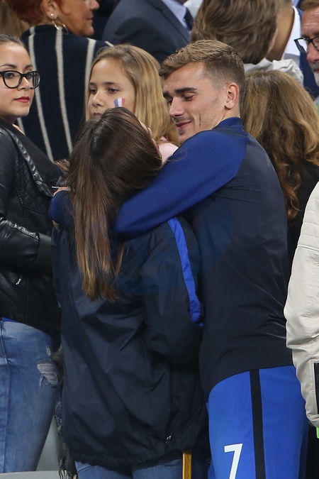 Info - Antoine Griezmann annonce sa retraite internationale - Naissance - Antoine Griezmann est papa d'un troisième enfant une petit fille prénommée Alba - Naissance - Antoine Griezmann est papa pour la deuxième fois d'un petit garçon prénommé Amaro - Antoine Griezmann et sa compagne Erika Choperena - Les joueurs retrouvent leur famille dans les tribunes à la fin du match de quart de finale de l'UEFA Euro 2016 France-Islande au Stade de France à Saint-Denis le 3 juillet 2016. © Cyril Moreau / Bestimage Please hide children's face prior to the publication - French Players reunited with their families in the stands at the end of the quarter-final match of UEFA Euro 2016 France-Iceland at the Stade de France in Saint-Denis July 3, 2016.