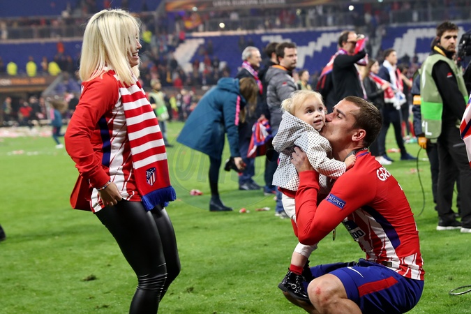 Info - Antoine Griezmann annonce sa retraite internationale - Naissance - Antoine Griezmann est papa d'un troisième enfant une petit fille prénommée Alba - Naissance - Antoine Griezmann est papa pour la deuxième fois d'un petit garçon prénommé Amaro - Antoine Griezmann, sa femme Erika Choperena et leur fille Mia après la finale de la Ligue Europa, l'Olympique de Marseille contre l'Atlético de Madrid au stade Groupama à Decines-Charpieu banlieue de Lyon, France, le 16 mai 2018. L'Atlético de Madrid a gagné 3-0. © Cyril Moreau/Bestimage - Merci de flouter le visage de l'enfant avant publication - UEFA Europa League, Final football match between Olympique de Marseille and Atletico de Madrid at Groupama Stadium in Decines-Charpieu near Lyon, France, on May 16, 2018. Atletico de Madrid won 3-0. - Please hide child face prior publication - Europa League, Final football match between Olympique de Marseille and Atletico de Madrid at Groupama Stadium in Decines-Charpieu near Lyon, France, on May 16, 2018. Atletico de Madrid won 3-0.